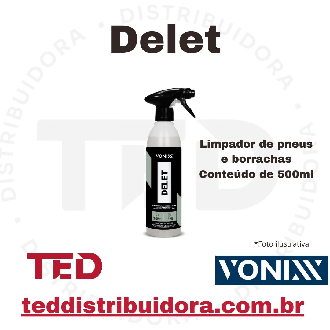 Delet é um limpador de alta performance, formulado exclusivamente para remover sujidade severa em pneus e borrachas, garantindo total limpeza, desenvolvendo originalidade e sem deixar aspecto acinzentado. Essa limpeza ajudará a melhorar a performance dos produtos para condicionar os pneus.